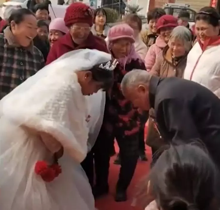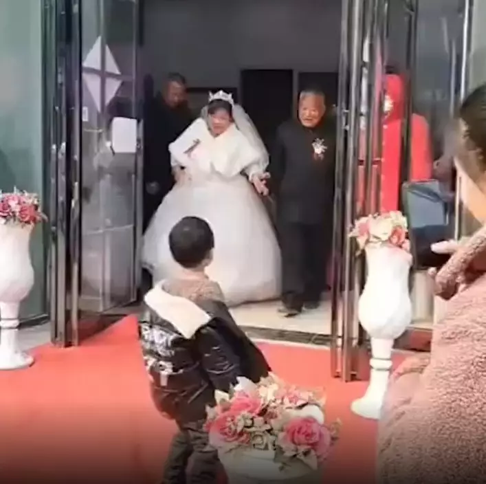 從老翁親友上載到社交平台的結婚片段可見,只見婚禮現場擺放著老翁和新娘甜蜜的結婚照,接親、走紅毯等儀式全都沒少,婚禮十分隆重,老翁牽著新娘的手,兩人幸福對視,頭貼頭,臉上都掛著幸福的笑容。