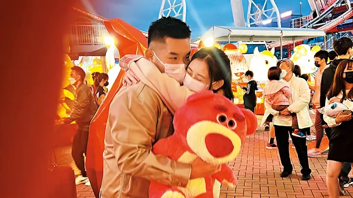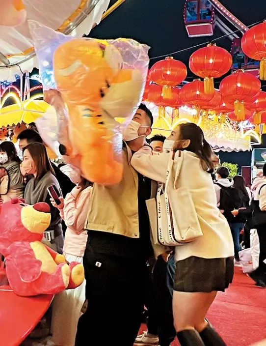玩攤位遊戲了得的班長,不停贏得獎品;而收到大公仔後,女友Angela就馬上攬着他,親熱一番作獎勵!