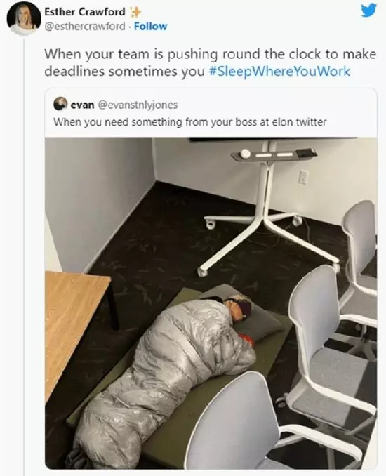 去年11月,克勞福德在Twitter總部睡在地板上的照片在網上瘋傳,成為新老闆馬斯克推廣的「硬核」工作文化的象徵。克勞福德當時寫道:「當你的團隊夜以繼日地趕最後期限時,有時你會#上班時睡覺#。」