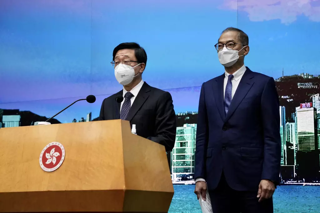 李家超(左一)宣布3月1日起撤銷口罩令。