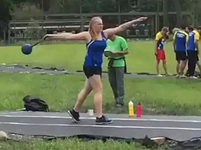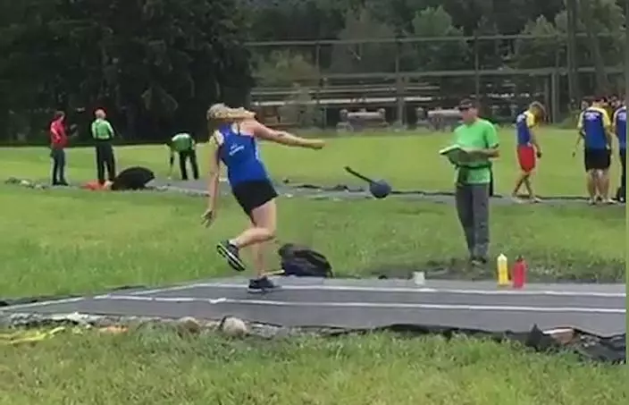 近日新西蘭一名田徑奧運冠軍上載短片,見到一名金髮女運動員準備投擲鏈球。她架勢十足,手持鏈球,伸直手臂後開始自轉蓄力。