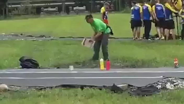 不過可能是太過緊張,選手僅旋轉了一圈,手中鏈球就飛脫了。重達四公斤鐵球直飛旁邊一名教練,直擊下體。教練經歷「男人最痛」,彎腰踎低,久不能站。