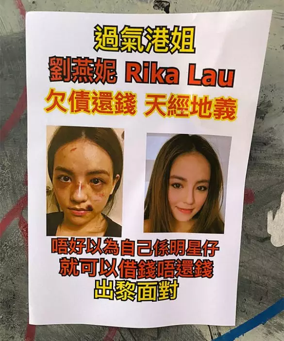 近日就有網友發現於尖沙咀K11商場附近,有多張有劉燕妮照片的追債大字報。