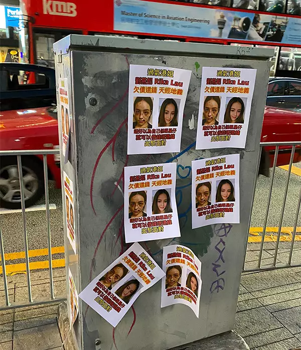 在尖沙咀K11商場附近有多張有Rika照片的追債大字報。