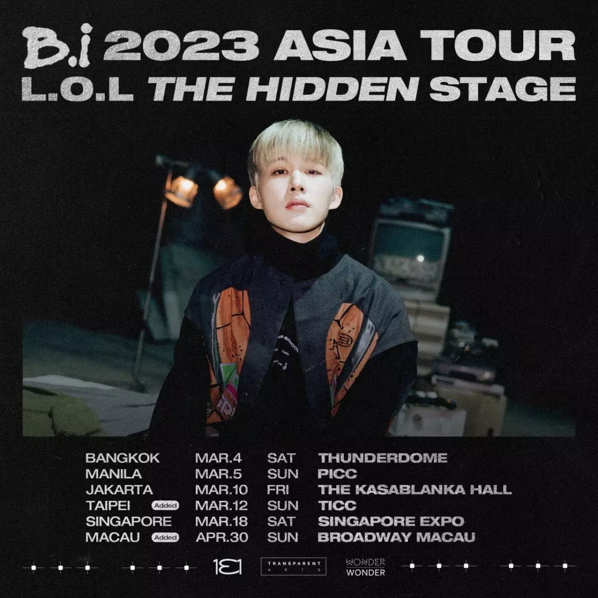 《B.I 2023 ASIA TOUR [L.O.L:THE HIDDEN STAGE] IN MACAU》將在「澳門百老匯」- 百老匯舞台舉行。門票在3月3日星期五中午12時起,在「澳門百老匯」網站公開發售。有關更多B.I澳門站巡演的相關資訊,可留意主辦及協辦單位的社交平台更新。