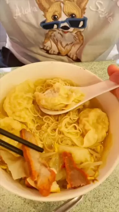 唐寧發現雲吞麵中有叉燒。