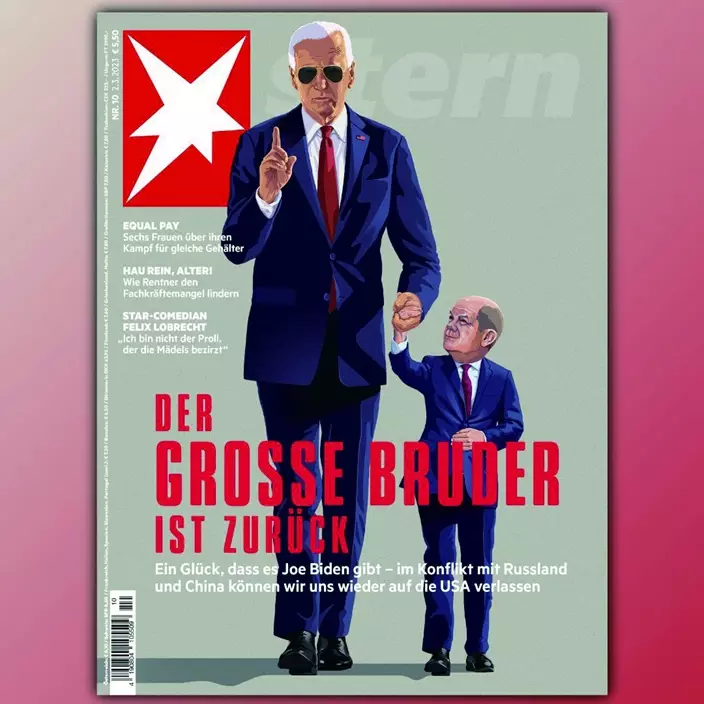 德國《明星》周刊最新一期的封面文章以「老大哥回來了」為題報道稱,對於朔爾茨來說,「幸運的是有拜登——我們可以在與俄羅斯和中國的衝突中再次指望美國」。封面漫畫是拜登牽著僅有其一半高的朔爾茨,後者卻仰望著「老大哥」。
