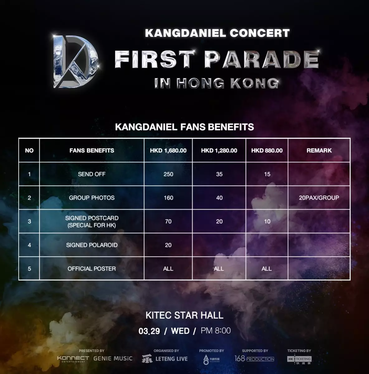由於今次是姜丹尼爾第一次以個人身份來香港演出,粉絲們的反應比預計還要熱烈,加上又有團體合照、接送福利、香港場專屬的簽名明信片,以及姜丹尼爾簽名即影即有,和全場觀眾均有的官方海報等豐富禮物。主辦單位亦特別提醒大家不要錯過這次機會,親身感受姜丹尼爾巡迴演唱會的盛況,門票現已在快達票公開發售。