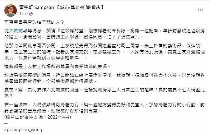 事件亦在社交網發酵,城市研究學者黃宇軒指,這些掛畫是工友生活的趣味,工友本身已經十分愛惜這個垃圾站,「休息位置執到好似屋企咁乾淨」,他表示不解署方「為何要作如此嚴厲的回應、這樣扼殺清潔工人日常生活的趣味?真的需要不近人情至此嗎?在一座城市,人們很難得可身體力行,讓一處地方變得更好和更怡人。那樣身體力行的小行動、對身處空間的善意改造,理應被好好珍惜與尊重。」