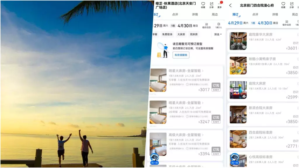 據內地旅遊平台攜程旅行顯示,五一假期首日(4月29日),北京天安門、南鑼鼓巷,上海外灘、迪士尼度假區,長沙五一廣場及重慶解放碑步行街附近均有酒店顯示滿房。此外,部分酒店已悄悄漲價,比如位於上海東方明珠塔內的230空中酒店,平日價格為28888元/晚,五一假期期間的價格已經漲到58888元/晚。位於麗江的宿研度假民宿,房價已從4月29日的1611元起漲至5月1日的2816元起,且5月1日標價3718元的最貴房型已被訂完。