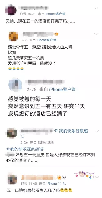 近日「現在才計劃五一旅遊已經晚了」成熱搜,社交平台上,很多網民稱早已規劃好了自己「五一」出行的計劃,並已提前購買機票和酒店,面對緊俏的旅遊產品,有網民驚呼:「現在就已經訂不到房了嗎?」、「低價機票隔一會兒就沒了!」