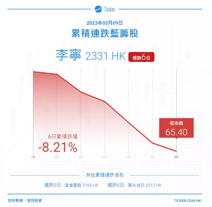 李寧(02331)連跌6天,累跌8.21%,今日收跌0.99%,報65.35元,大市成交4.59億元。
