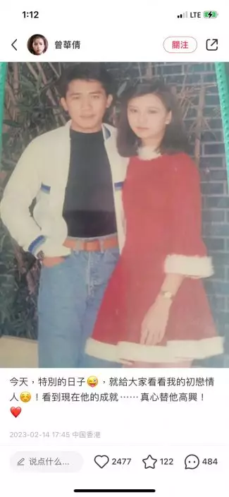曾華倩於情人節在小紅書上載與初戀情人偉仔的陳年合照。