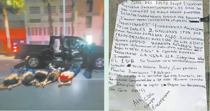 《美國有線電視新聞網》(CNN)稱,網上發布的照片顯示,5名男子臉朝下躺在人行道上,旁邊站著身穿制服的執法人員。「道歉信」還說,蠍子集團向馬塔莫羅斯社會、在上周槍戰中遇害的一名墨西哥公民家屬以及受影響的美國人民和家庭道歉,「我們強烈譴責上周五發生的事件,決定移交那些直接參與這次行動的人,他們違反了本集團一貫的運作規則」。《美聯社》提到,目前尚不清楚這5名男子是否與綁架案有任何實質聯繫,墨西哥當局將對5人進行審問,以確定他們是否參與了綁架行動。