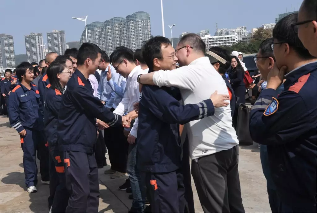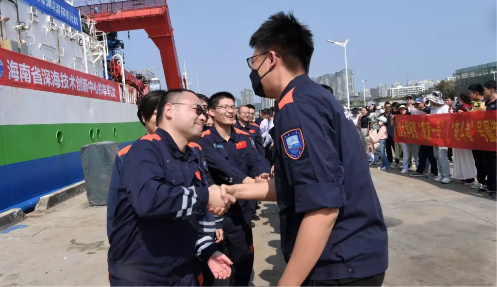 「探索一號」科考船攜「奮鬥者」號全海深載人潛水器抵達三亞,參與任務的科學家與前來歡迎的人們握手。新華社