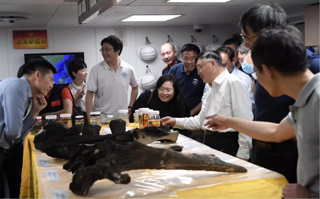 「探索一號」科考船攜「奮鬥者」號全海深載人潛水器抵達三亞,科研人員介紹採集到的深淵宏生物、岩石、結核、沉積物樣本。 新華社