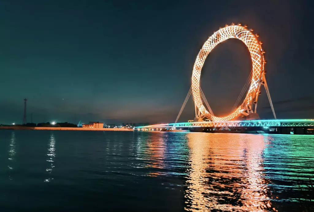 山東濰坊無軸摩天輪「渤海之眼」夜景。 百度圖片