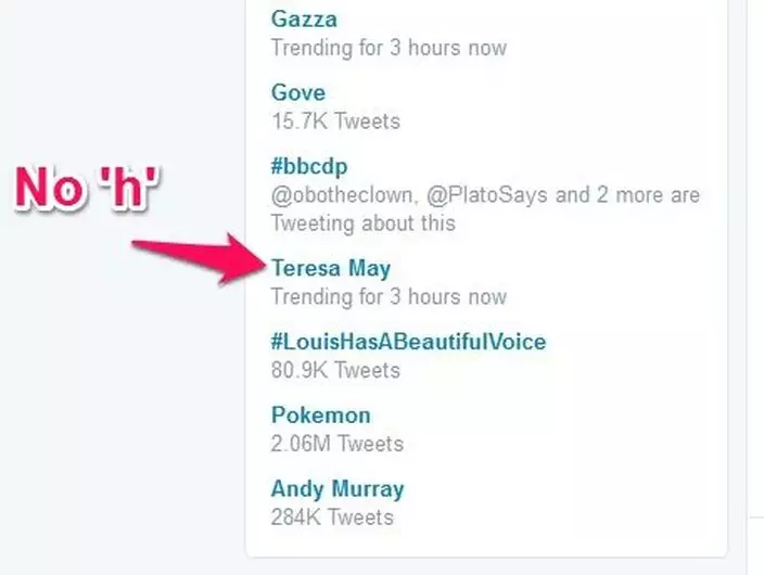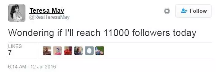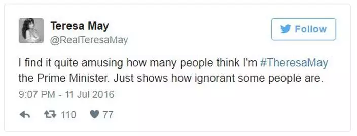 Teresa本人亦覺得好笑,不得不在Twitter澄清自己並非首相,除了驚喜自己追蹤粉絲數目飆升至近11000人外,還嘲笑弄錯她的名字的無知。