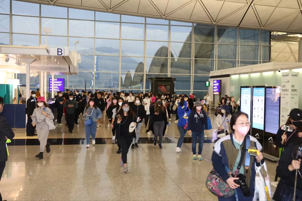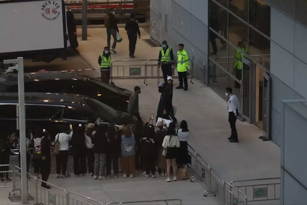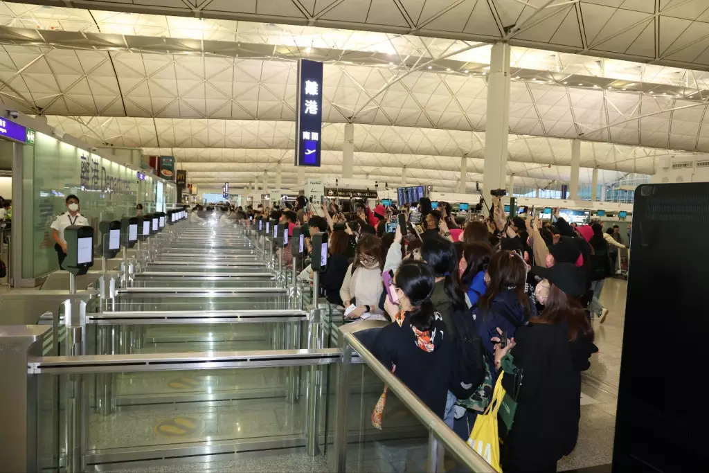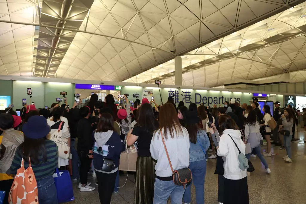 過百粉絲一早在離境大堂守候偶像,手持應援名牌和公仔送機,Anson Lo的粉絲更穿上偶像自家品牌服裝和帽。