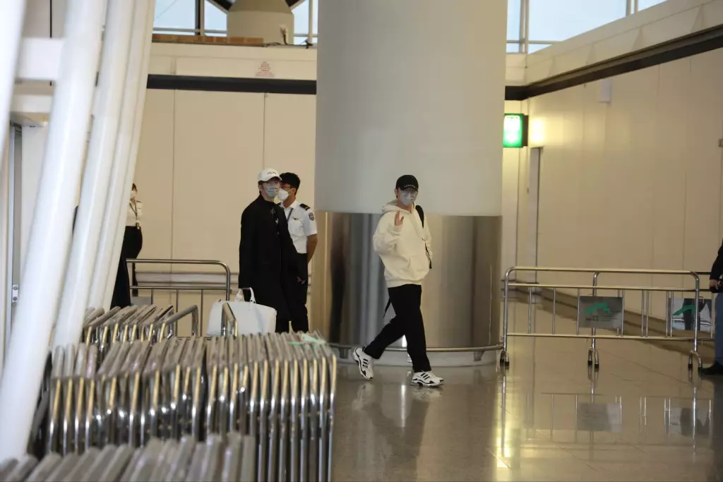 由於粉絲眾多,機場方面架起圍欄,預留通道給旅客。大約早上6時半,Anson Lo和Edan乘坐7人車抵達機場,司機先下車為他們卸下行李,其後二人下車,經理人花姐亦有同行,一同由職員通道步往離境大堂。