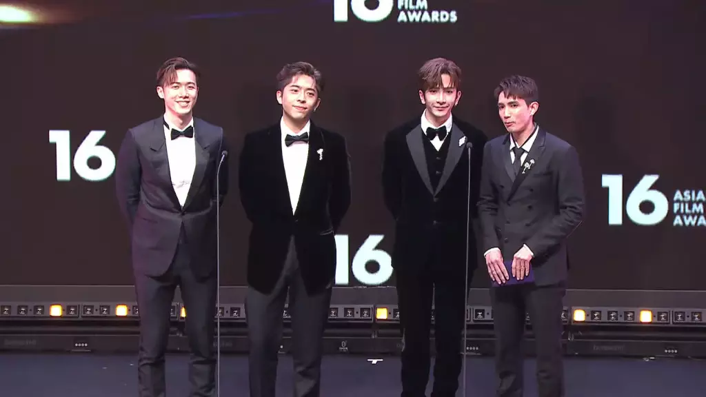 Anson Lo(左二)及Edan(右二)盛裝出席「第16屆亞洲電影大獎」。