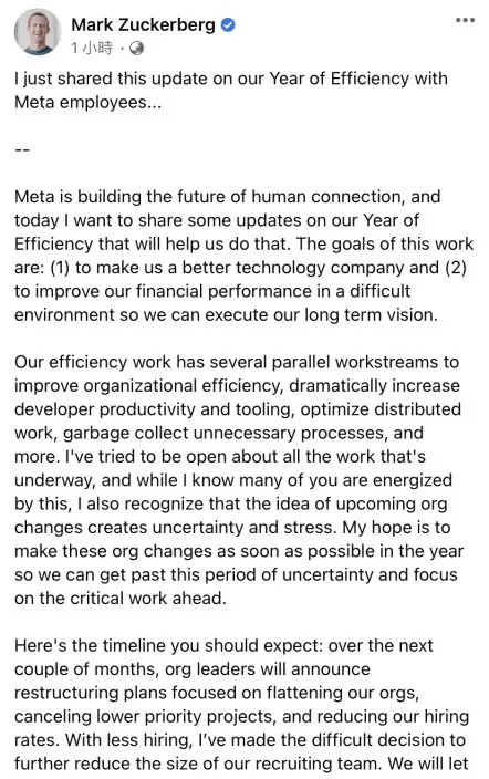 朱克伯格寫道:「我們預計將在4月底宣布技術部門的重組和裁員,然後在5月底輪到業務部門。」他還表示,「在少數情況下,可能要到年底才能完成這些變化」,預計團隊整體將減少約1萬人,並關閉約5000個尚未聘到人的額外崗位。