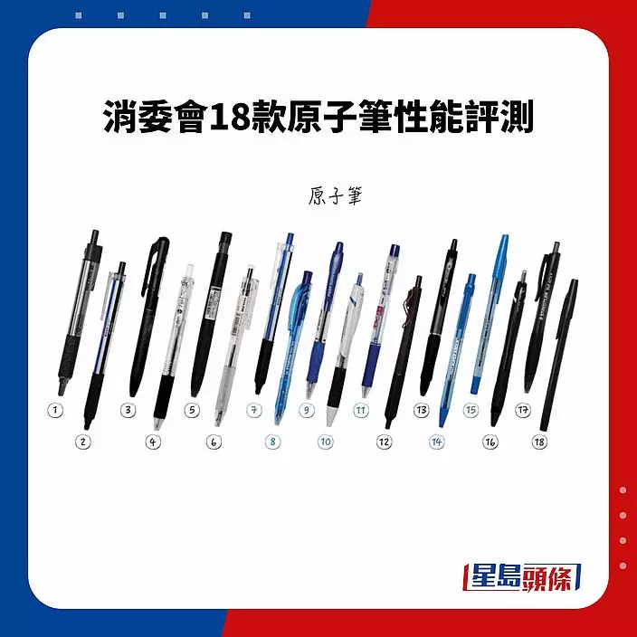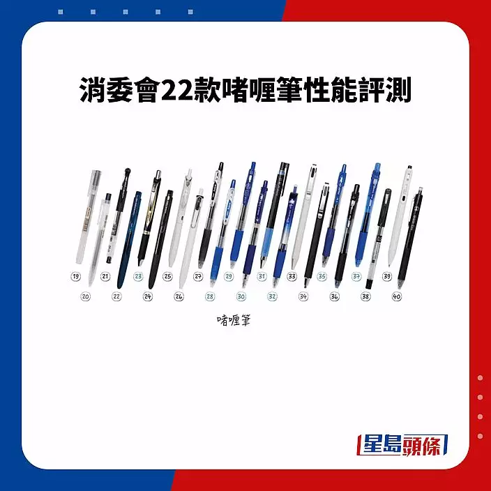 消委會是次試驗評估了40款筆的書寫性能和安全程度,包括18款原子筆(ballpoint pens,又稱油墨圓珠筆),以及22款啫喱筆(gel ink pens,又稱中性墨水圓珠筆)。當中6款標示的筆尖圓珠直徑為0.38mm;3款標示為0.4mm;18款為0.5mm;9款標示或網頁說明為0.7mm;餘下4款則只有「fine(細)」或F等說明。墨水顏色方面,則有22款為黑色;15款為藍色;以及3款為藍黑色(blue black或night black)。此外,35款屬按壓式型號,方便隨時書寫;餘下5款則為揭蓋式型號。各樣本分別購自文具店、精品店和網店,每枝筆售價由$2.4至$86,售價懸殊。