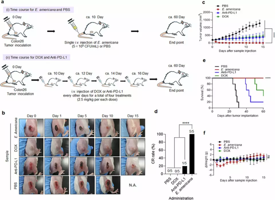 研究指出,E. americana 具備「雙重抗癌機制」。一方面,該細菌可直接分泌具細胞毒性的物質,破壞腫瘤細胞。另一方面,也能激活體內多種免疫細胞,包括T細胞、B細胞及中性粒細胞,形成協同免疫反應。在對照實驗中,使用抗 PD-L1 抗體或脂質體阿霉素的組別,完全緩解個案極少甚至未見,而 E. americana 則在同一模型下實現全面腫瘤清除。