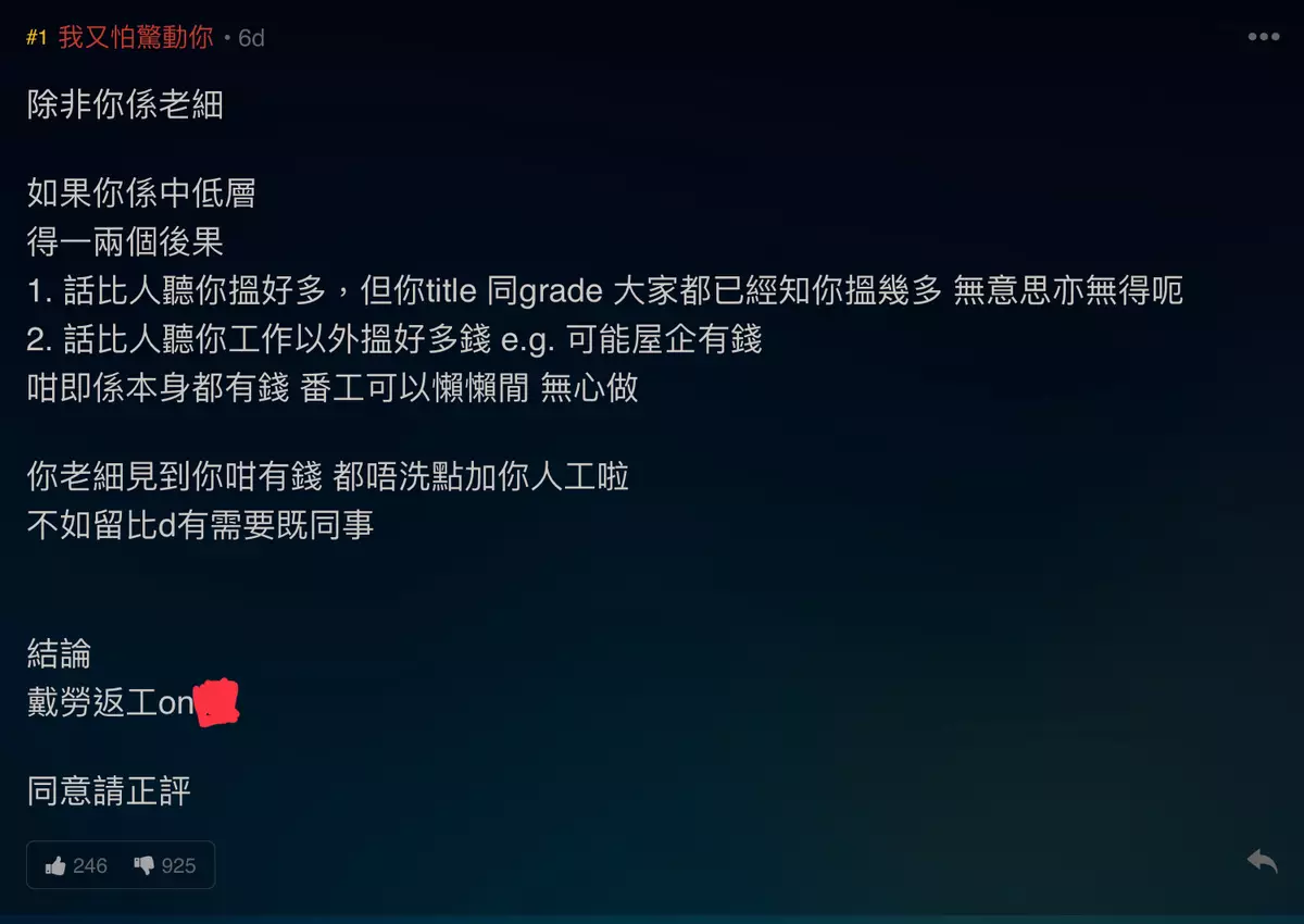 樓主更指老細知道你有錢,就不會加你人工,寧願加人工予其他有需要的同事。