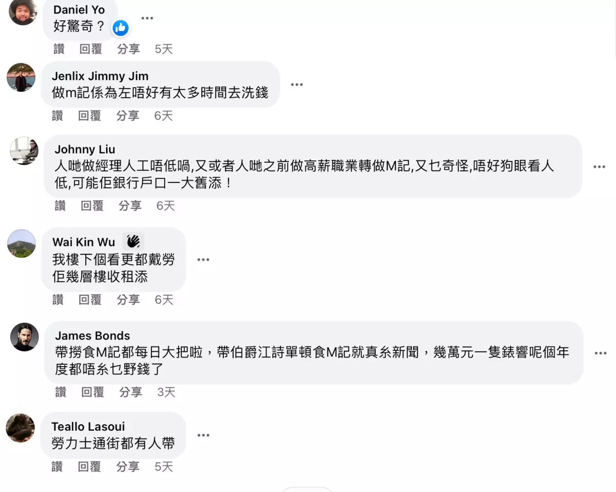 名錶往往是身份地位的象徵,勞力士錶更是令人趨之若鶩,很多款式即使有錢亦未必買到。近日有名網民於Facebook群組發文並上載照片,指見到一名麥當勞員工戴著一隻非常名貴的勞力士錶,提出快餐店薪金與勞力士價格不相符的質疑。不過其他網民則認為樓主「狗眼看人低」及少見多怪;亦有網民猜測,那隻勞力士是假貨。同一時間,另一討論區亦有人發文和應,分折出兩個不應戴勞力士返工的原因,不過也是負評居多。
