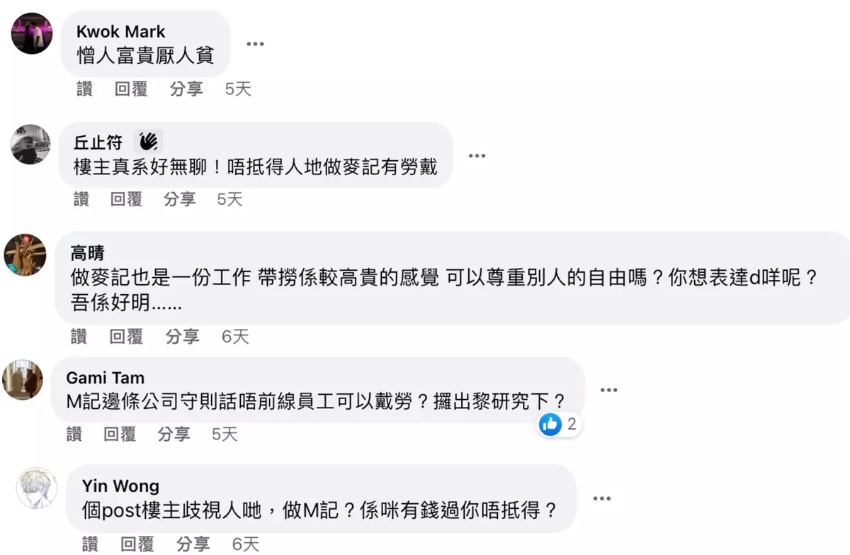 帖文一出引起熱烈討論,很多網民都應為樓主帶有歧視眼光,瞧不起人「個post樓主歧視人哋,做M記?係咪有錢過你唔抵得?」、「戴勞要分職業先可以帶?」、「憎人富貴厭人貧」、「做麥記也是一份工作,帶撈係較高貴的感覺,可以尊重別人的自由嗎」、「做任何工作都可以戴架」。