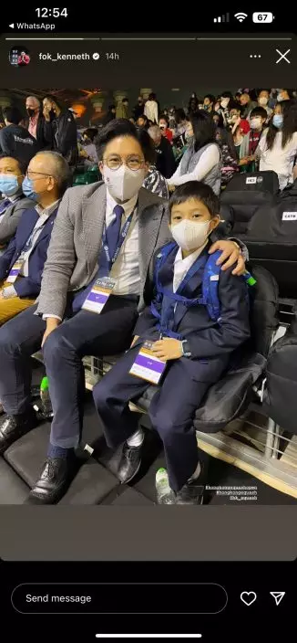 霍啟剛和兒子坐在最前位置觀賞壁球公開賽。