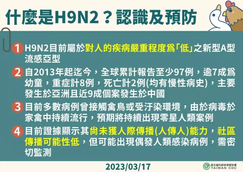 防檢局表示,金門縣動植物防疫所(金門防疫所)執行禽流感防疫計劃於金門縣金寧鄉一紅羽土雞場採樣監測,畜衛所3月16日檢出曾有禽傳人感染先例的H9N2低病原性禽流感,因此新亞型病毒是台灣首度檢出,並且依照國際禽流感案例來分析,新亞型的禽流感病毒透過候鳥遷徙、移動等會造成多點傳播,不容易防控。