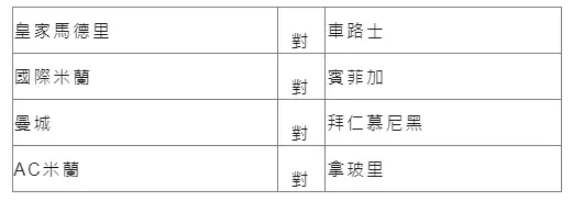 至於意甲三雄,AC米蘭和拿玻里就會內訌;而國際米蘭抽好簽遇上賓菲加,兩場勝方在4強碰頭。