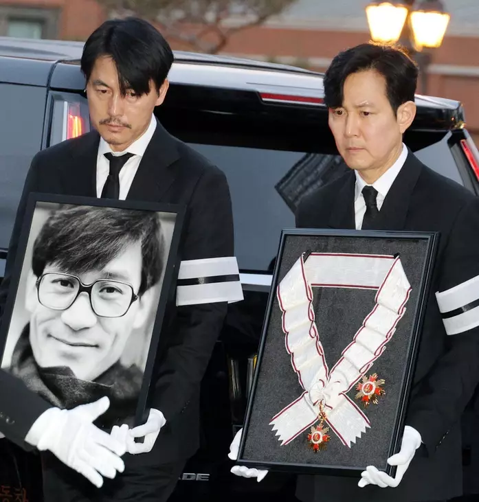 演員鄭雨盛手捧遺像;李政宰捧持政府追授的一級金冠文化勳章。網上圖片