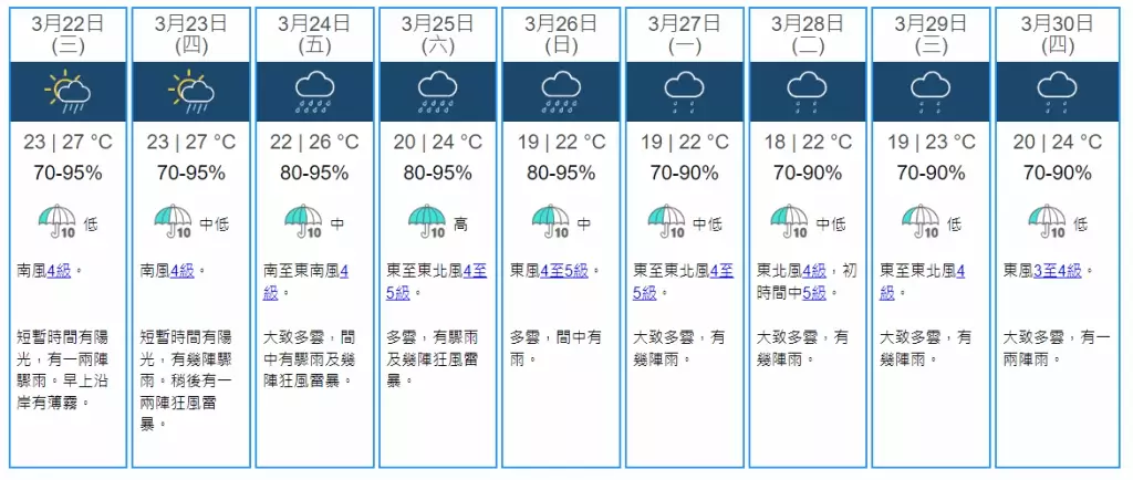 2023年3月21日是二十四節氣當中的「春分」,象徵春回大地,萬物復蘇,不過一股偏南氣流正影響廣東沿岸,同時一道雲帶正覆蓋該區,本港21日大致多雲,氣溫介乎23至27度。天文台表示,22日有一兩陣驟雨,早上沿岸有薄霧,日間短暫時間有陽光,氣溫介乎23至27度,吹和緩偏南風,展望23日短暫時間有陽光,亦有幾陣驟雨,隨後一兩日驟雨逐漸增多及有雷暴,下周初氣溫稍為下降,仍有幾陣雨。