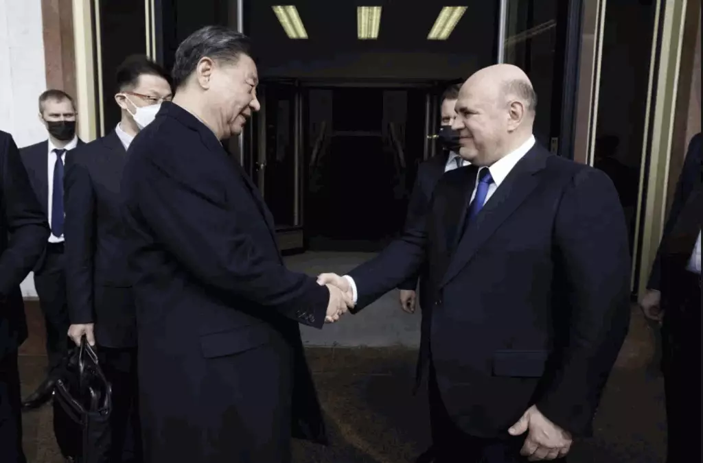 國家主席習近平與俄羅斯總理米舒斯汀握手。美聯社