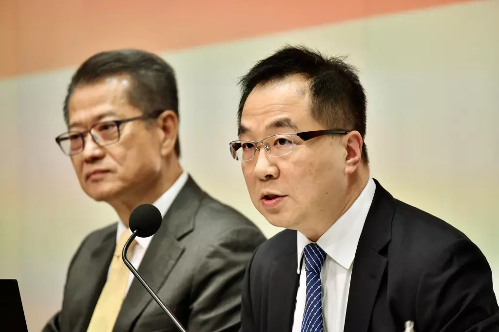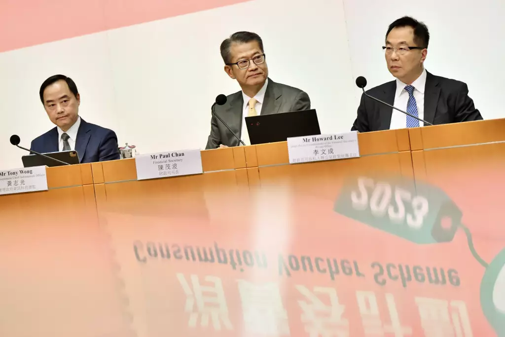 財政司司長陳茂波(中)和財政司司長私人辦公室政策統籌主任李文成(右)公布消費券詳情。資料圖片
