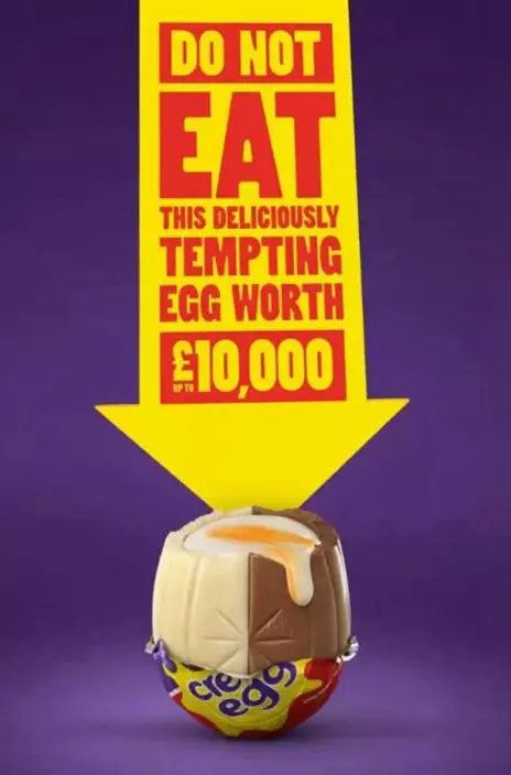 原來亞當手中的這粒朱古力蛋是吉百利所推出的限量版本。從去年聖誕節到今年4月復活節前,吉百利於英國舉辦了特別的「開獎活動」(Cadbury Creme Egg Hunt),只要民眾買到的是「一半白朱古力、一半牛奶朱古力」的太極版本朱古力蛋(全活動僅280顆),就可以憑此蛋去兌換1萬英鎊現金,而它黑白參半的模樣,的確與電影《未來戰士》半人半機器的形象不謀而合。