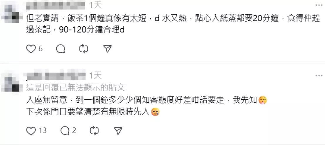有其他網民都遇到相同經歷,「我都試過,聽到話個半鐘要交檯立即掉頭走」,「去飲茶就係想同朋友家人慢慢傾下計,限我時間甘我咪去第二間囉」、「所以點解個個都北上消費」、「咁好生意唔好入去阻住佢了」、「香港垃圾餐飲業,規矩多多,見到一定不消費」、「講真佢唔寫出黎,可能我都係呢啲時間走,但你寫出黎我就唔去食,因為覺得你係到計緊。」