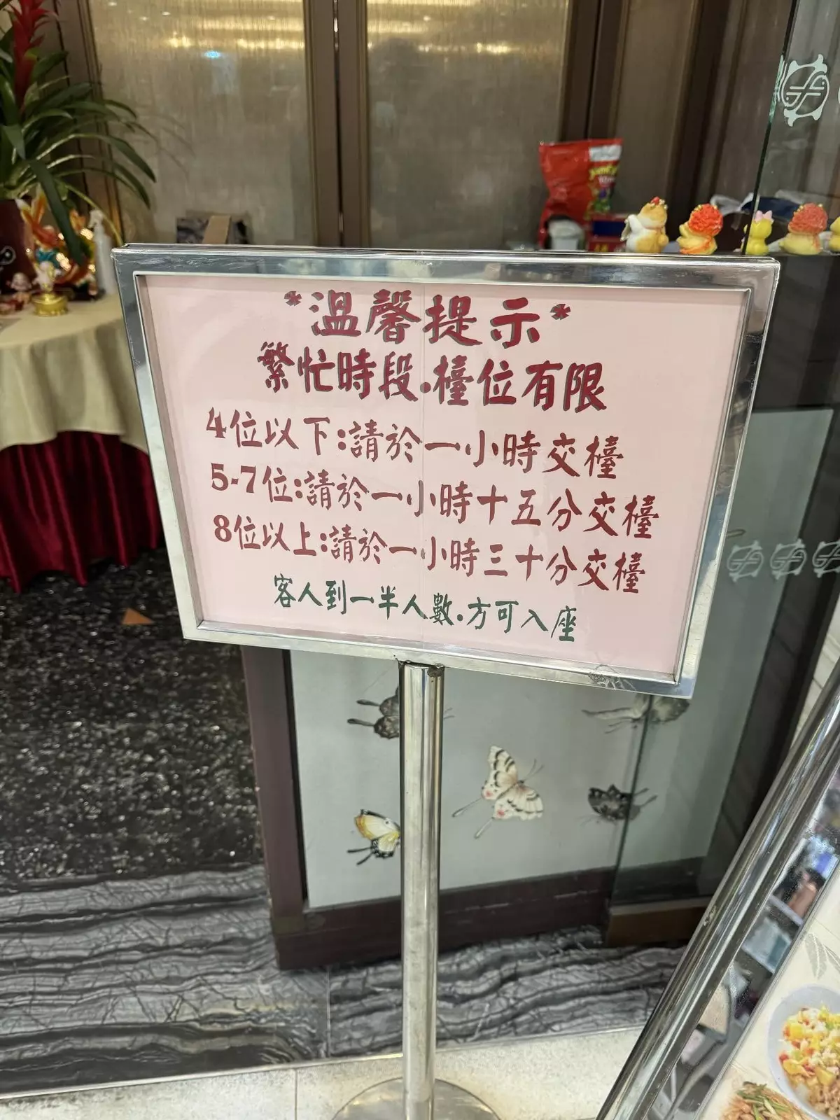 女網民在社交平台Threads有發帖表示,「估唔到依家一個人一盅兩件,都唔可以坐太耐了」,並上載一張顯示了某間酒樓門口「溫馨提示」告示牌,牌上寫著由於檯位有限,繁忙時段會設有特別的交枱時限,4位或以下只限1小時、5至7位限1小時15分,8位以上限1小時30分交檯,客人需有一半人數到場,方可入座。