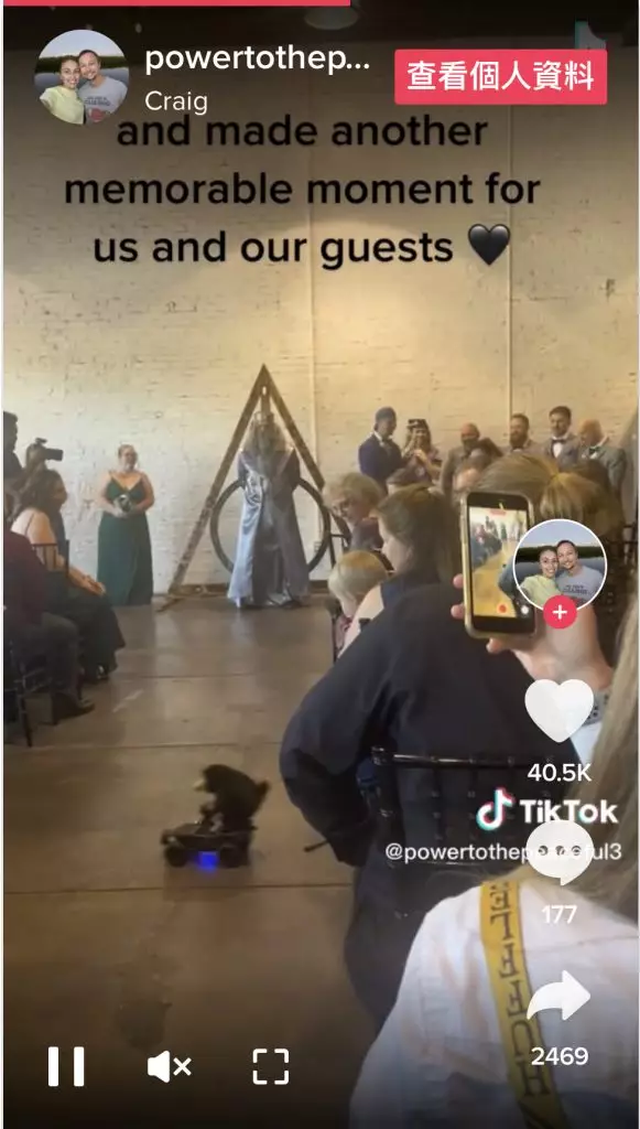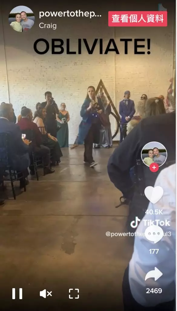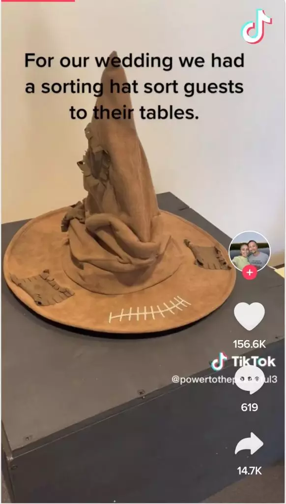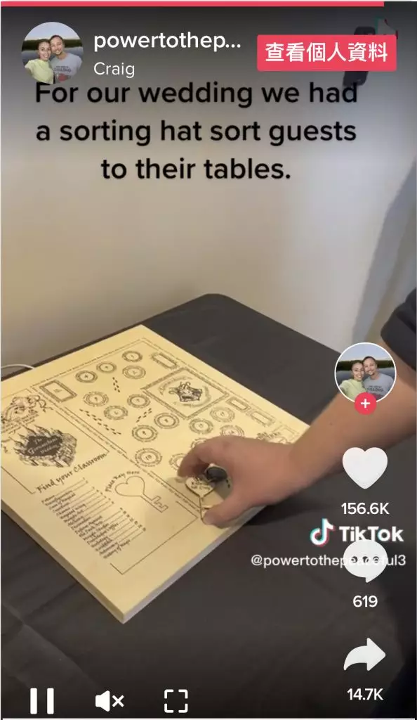 據外媒報導,「哈利波特主題」婚禮的新郎克雷格(Craig)日前在TikTok上與網友分享了幾段自己婚禮現場的影片,吸引了大批網友的關注。原來婚禮上賓客們的位置分佈是以「激活分類帽」的形式決定的。影片中,有賓客將鑰匙放在互動板上的「激活」一旁的分類帽,緊接著分類帽便緩緩地說出「有趣、有趣,(賓客名字)野心勃勃……狡猾的史萊哲林!歡迎參加魁地奇比賽」,從而成功將賓客分門別類到屬於他們的座位上。