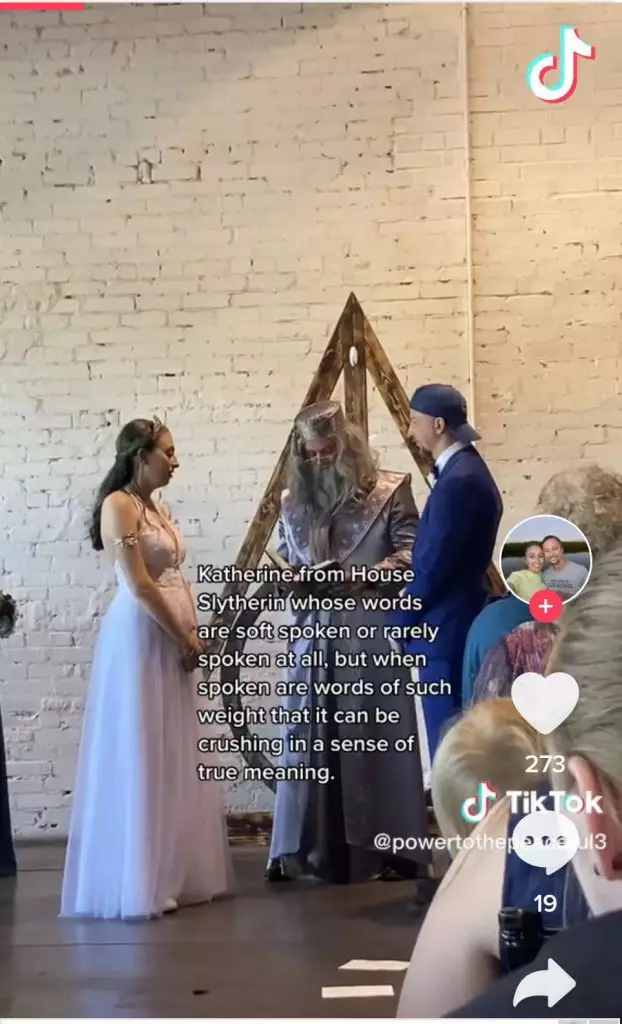 多元化的婚禮風格在現代越來越盛行,許多新人會根據個人喜好或結合當下流行趨勢來打造婚禮風格,將婚禮現場佈置成不同主題。近日美國有對新人的另類主題婚禮在網上掀起熱議,他們將發揮創意將婚禮設定為「哈利波特主題」,非常吸睛之餘,婚禮現場的分類帽竟真的會動!