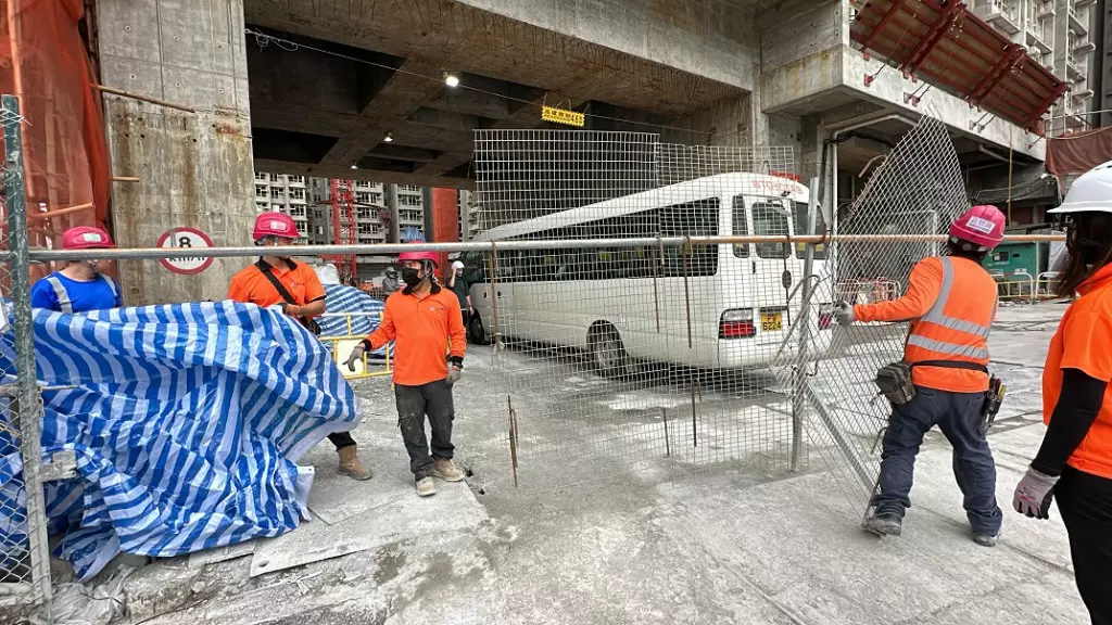 承建商派人把守在地盤外,讓小巴進入後便用帆布遮蓋地盤外圍鐵絲網欄杆。