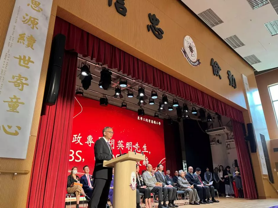 胡英明亦於23日下午出席位於粉嶺的東華三院曾憲備小學校舍設施命名典禮。胡英明在致辭時表示,小朋友是國家及香港的未來,指小朋友成長路上「學校生活」佔重要位置,認為求學時所學到的知識直接影響每位同學的思想發展和價值觀。