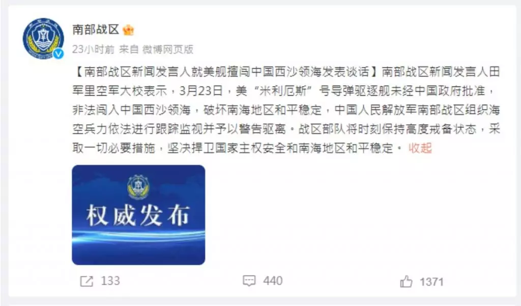 內地傳媒澎拜新聞3月23日上午報導:「南部戰區新聞發言人田軍裡空軍大校表示,3月23日,美米利厄斯號導彈驅逐艦未經中國政府批准,非法闖入中國西沙領海,破壞南海地區和平穩定,中國人民解放軍南部戰區組織海空兵力依法進行跟蹤監視並予以警告驅離。戰區部隊將時刻保持高度戒備狀態,採取一切必要措施,堅決捍衛國家主權安全和南海地區和平穩定。」