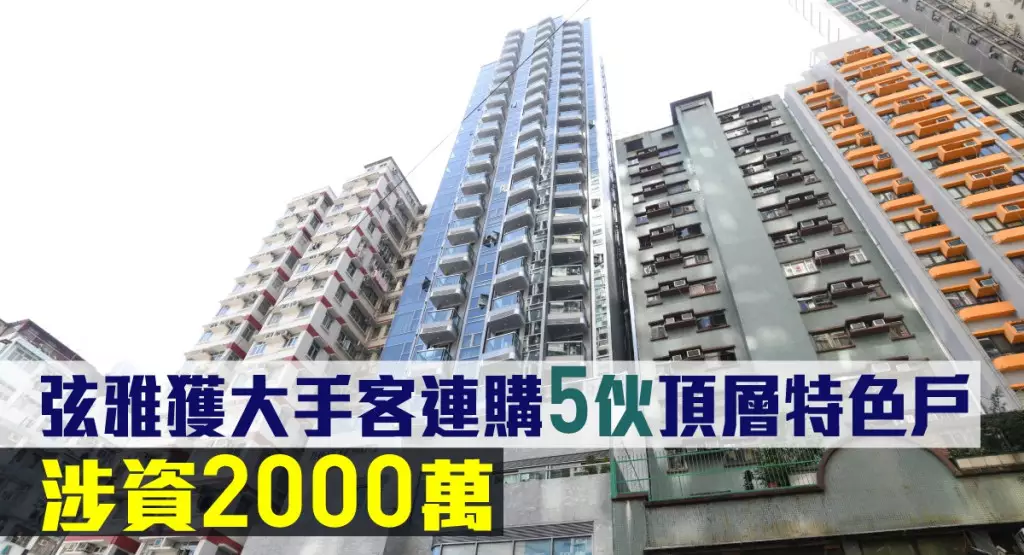 佳兆業發展的長沙灣弦雅錄大手客連購5伙成交,據成交記錄冊顯示,全為頂層25樓全層共5個單位,即A至E室,以2000萬易手,並以「一約多伙」方式成交。