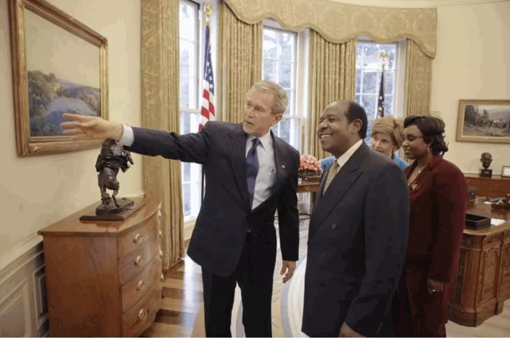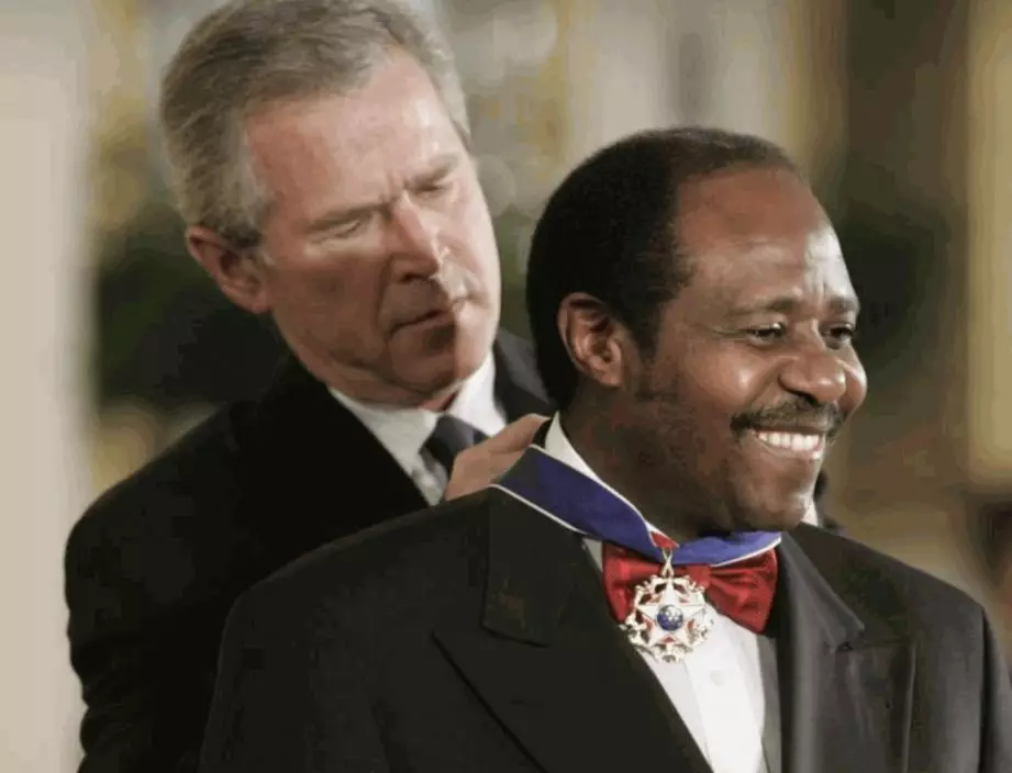 2005年,魯塞薩巴奇納獲時任美國總統布殊頒授「總統自由勳章」,背後女士(紅衣)為其妻子。(美聯社)