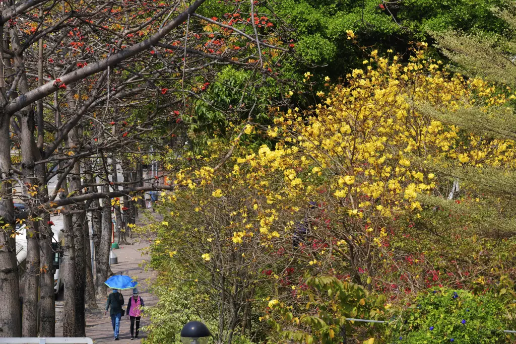 黃花風鈴木與木棉花於長沙灣麗翠苑盛開,黃花紅花互相輝映。