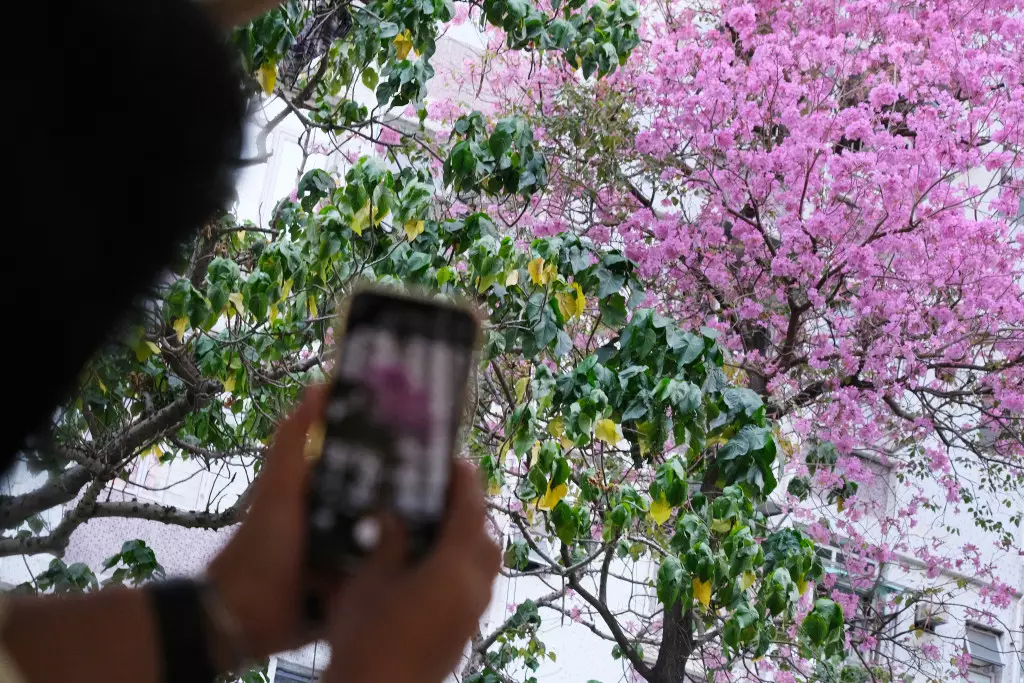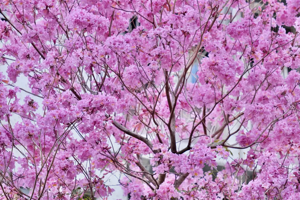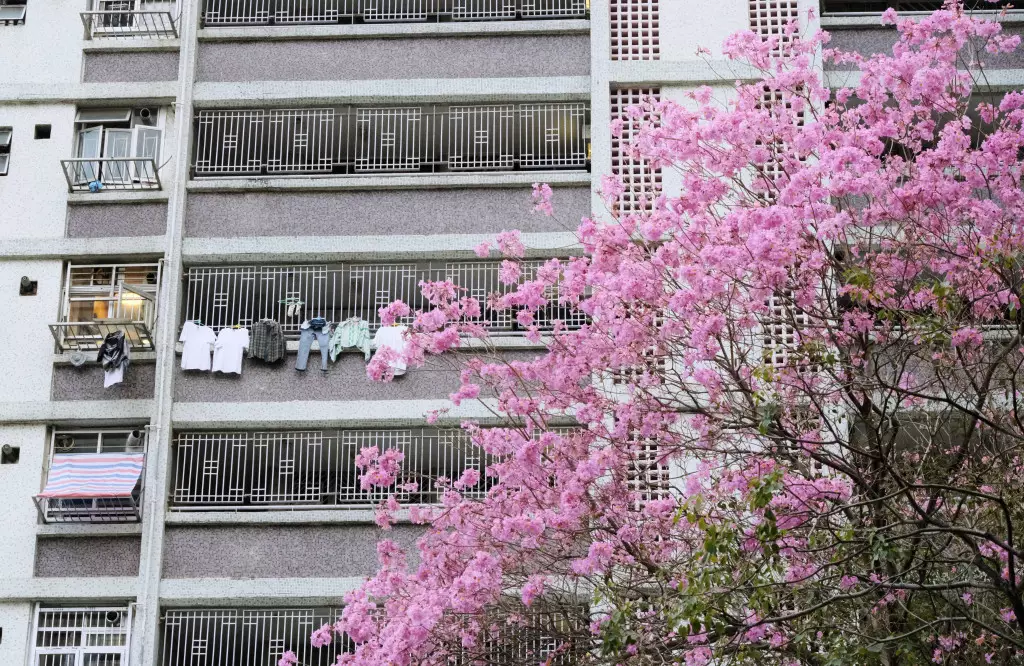 葵芳一個屋邨內紅花風鈴木正在盛放。